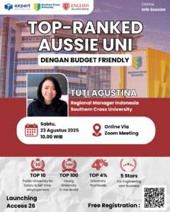 English Acceleration (EA) kembali membawa kabar gembira bagi masyarakat yang bercita-cita melanjutkan studi ke luar negeri, khususnya ke Negeri Kanguru. Pada Sabtu, 23 Agustus 2025 pukul 10.00 WIB, EA akan menggelar seminar online via Zoom bertajuk “Kuliah di Australia Bersama Top-Rank University dengan Budget Friendly”. Acara ini menghadirkan Tuti Agustina, Regional Manager Indonesia Southern Cross University. Yang akan berbagi informasi lengkap tentang peluang kuliah di salah satu universitas terbaik Australia. Kegiatan ini terselenggara berkat kolaborasi antara Southern Cross University, Expert Education, dan English Acceleration.